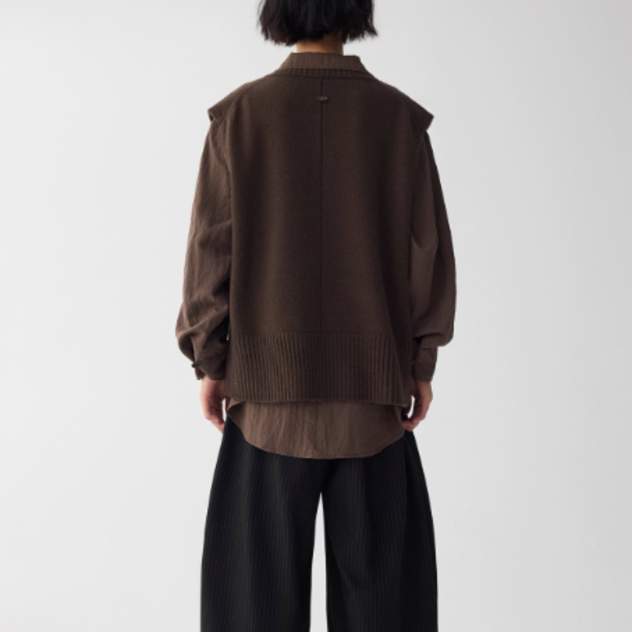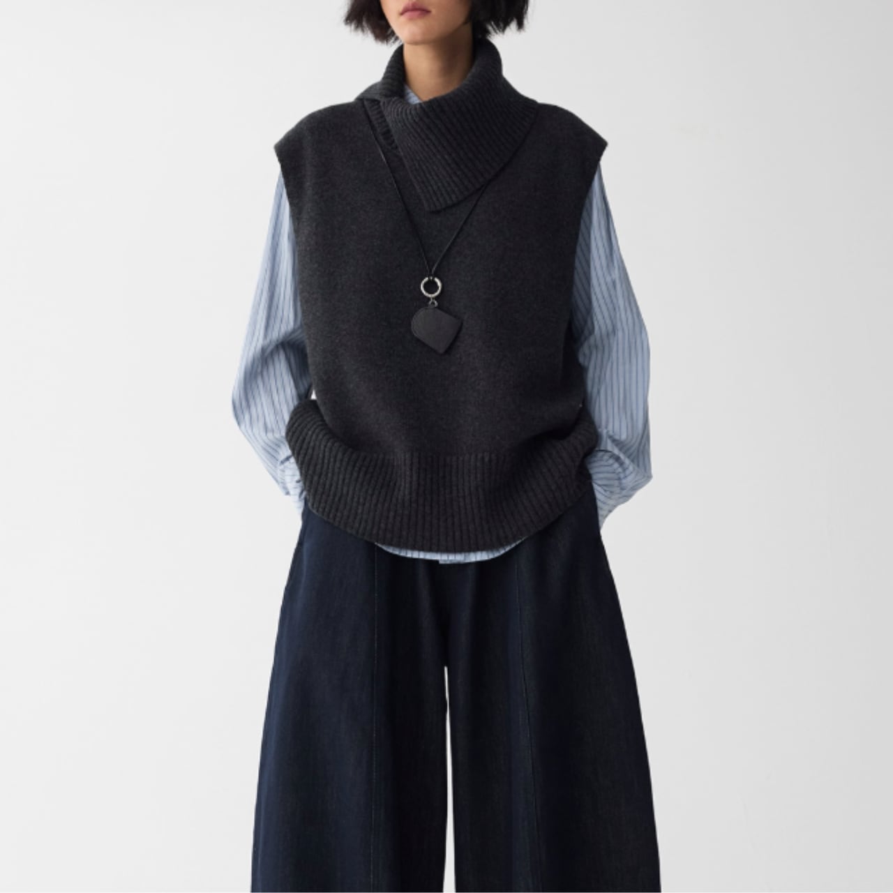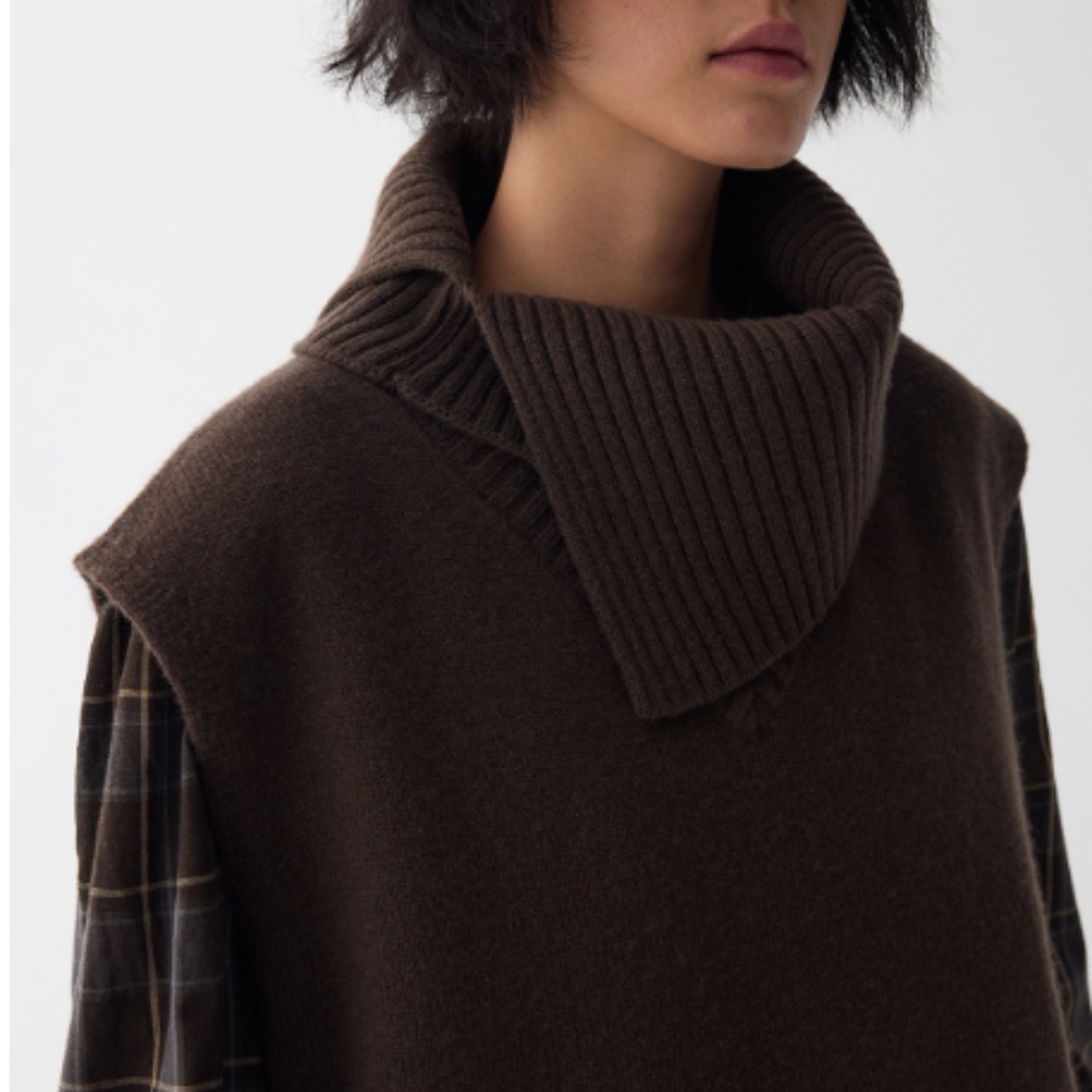 取り外し可能なネックウォーマー付きデザインは、シンプルなニットベストに遊び心を加え