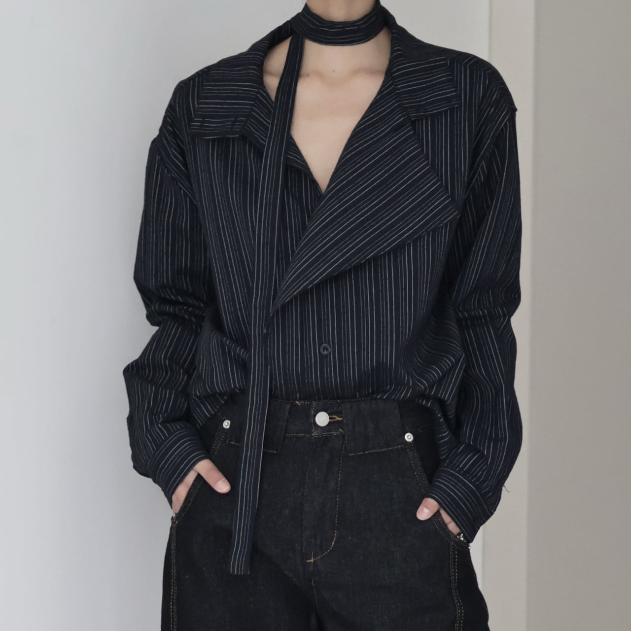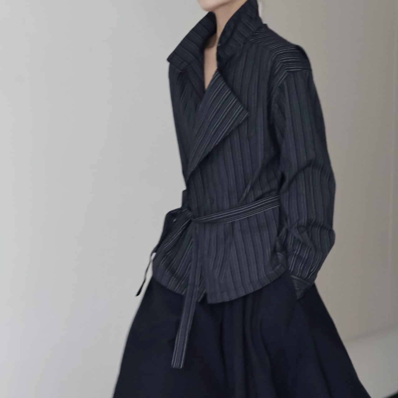 ベルト付きストライプシャツジャケット