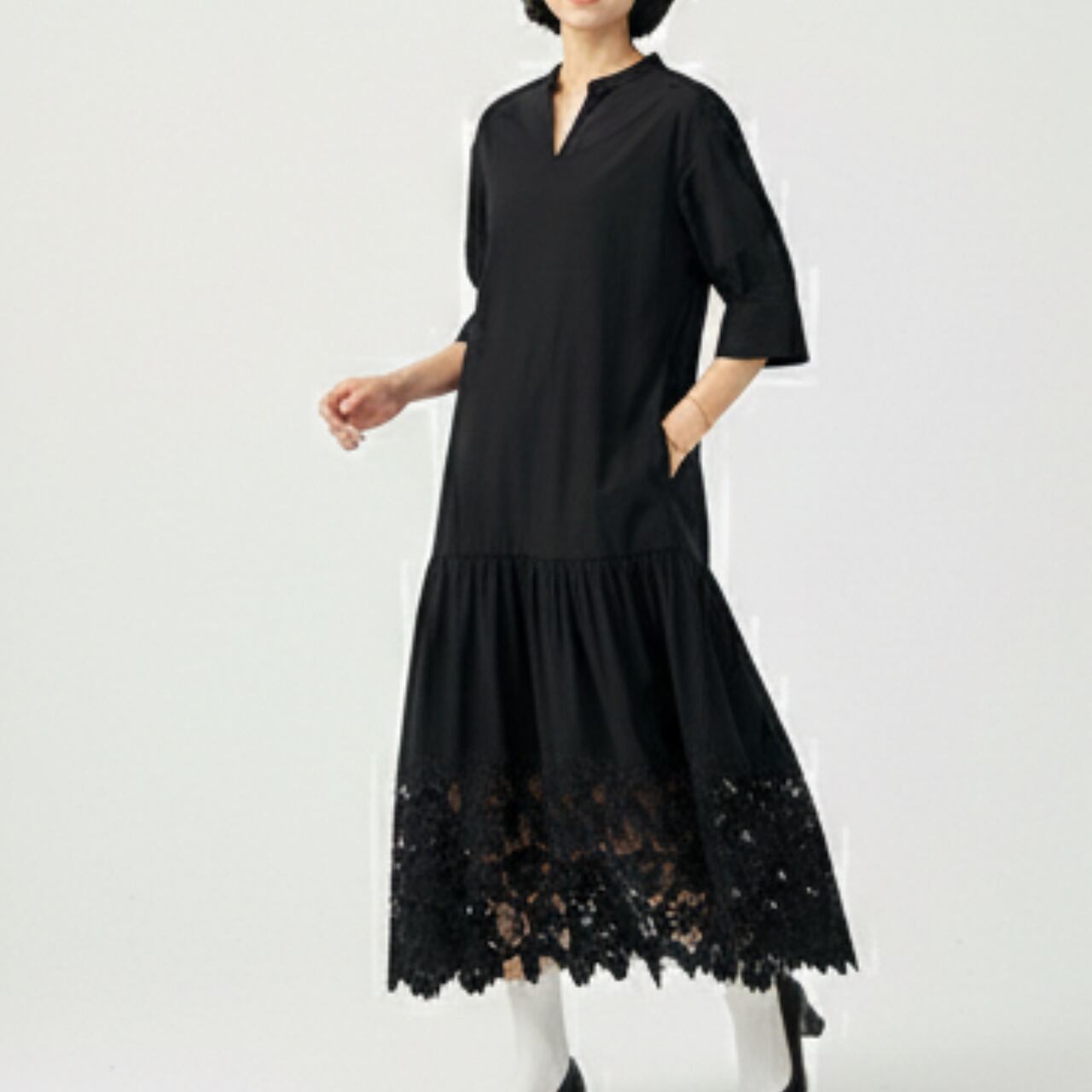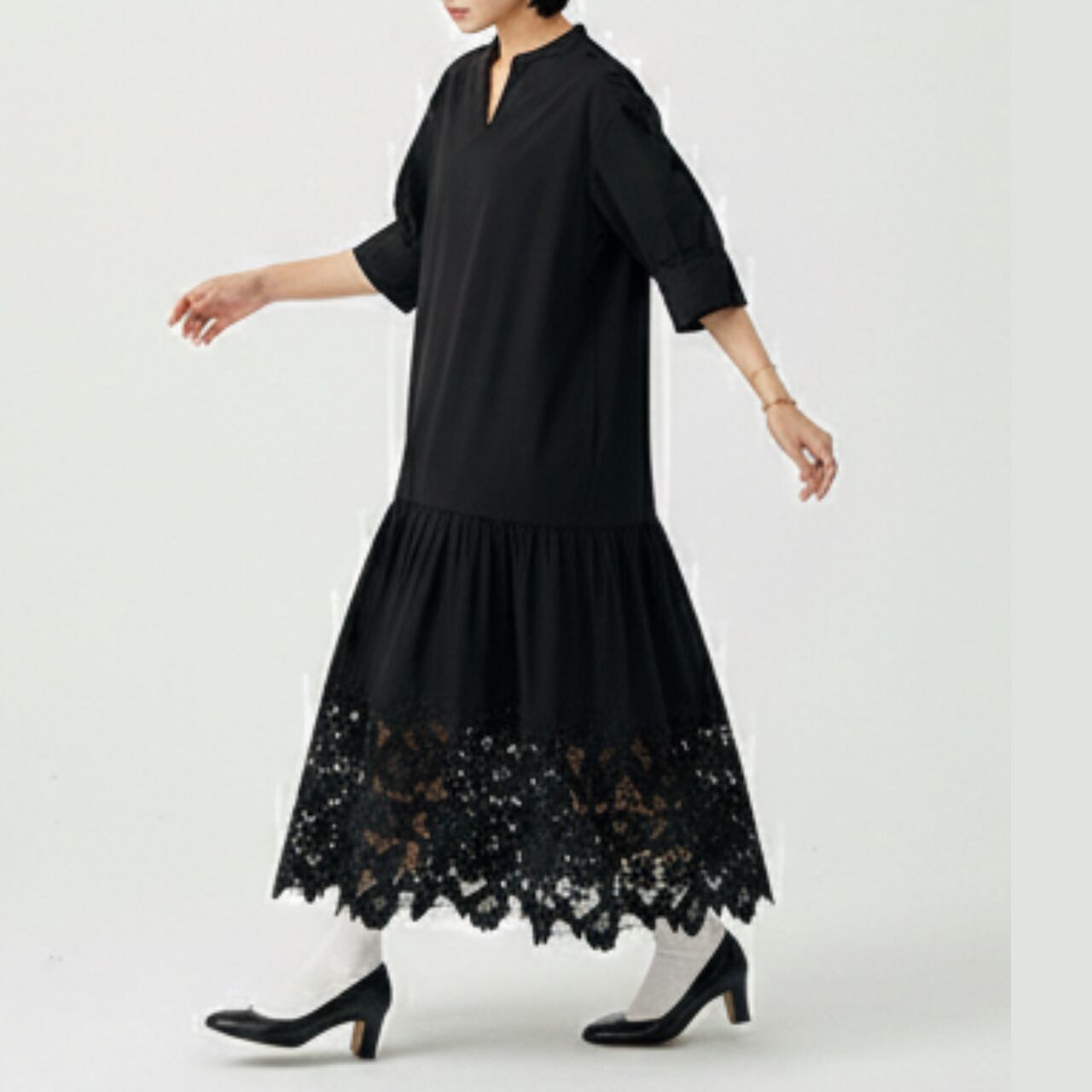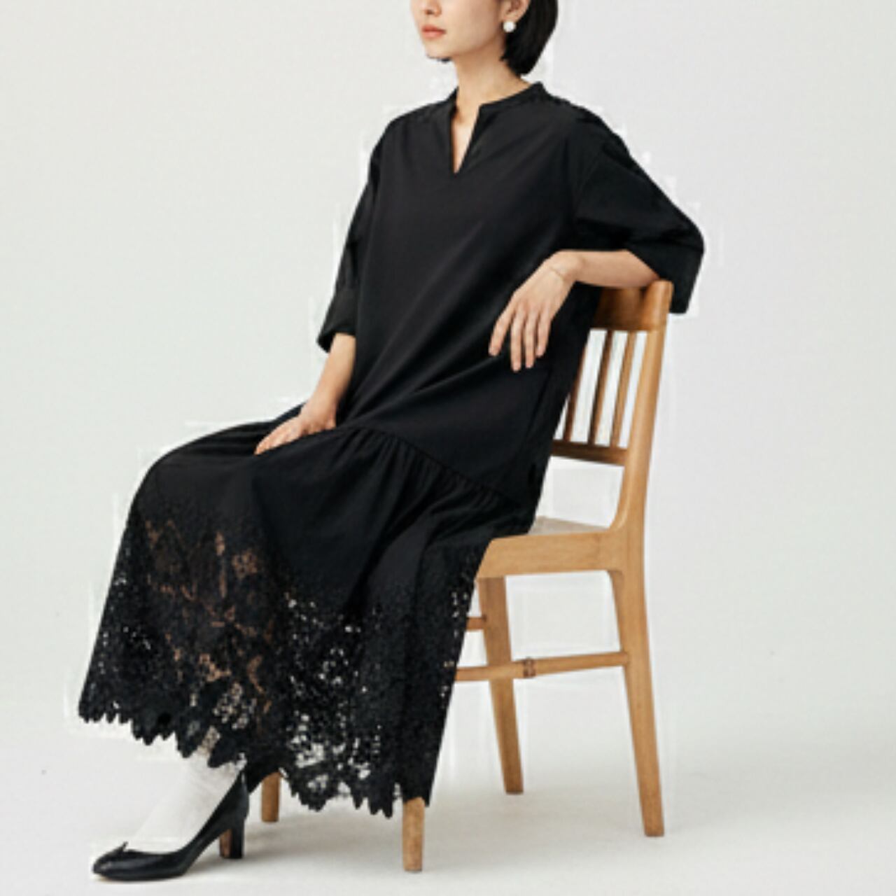 裾のレースがアクセントになったワンピース。Vネックのデザインが、首元をすっきりと見せてくれます。ちょっとしたお出かけにも、普段使いにも活躍する一枚です。