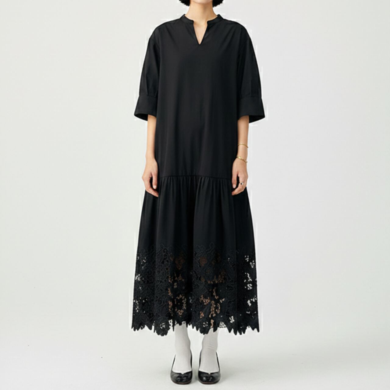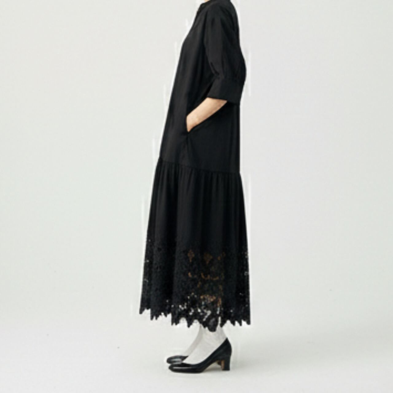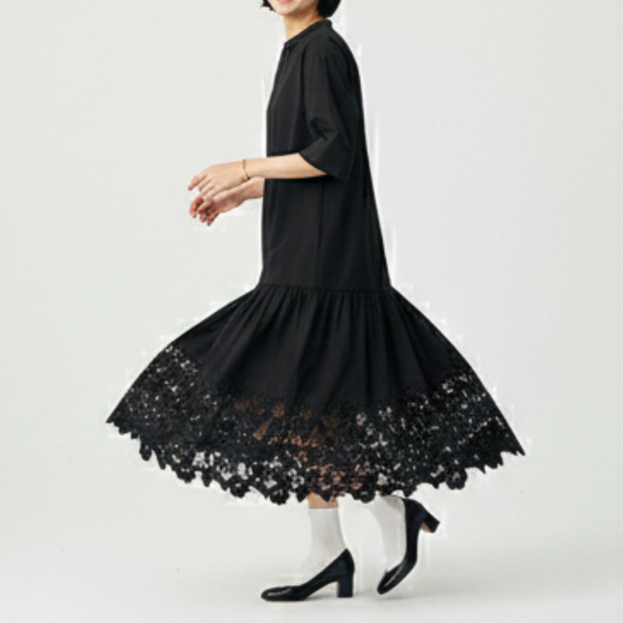 裾のレースがアクセントになったワンピース。Vネックのデザインが、首元をすっきりと見せてくれます。ちょっとしたお出かけにも、普段使いにも活躍する一枚です。