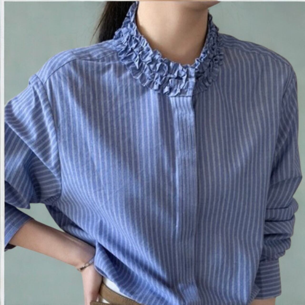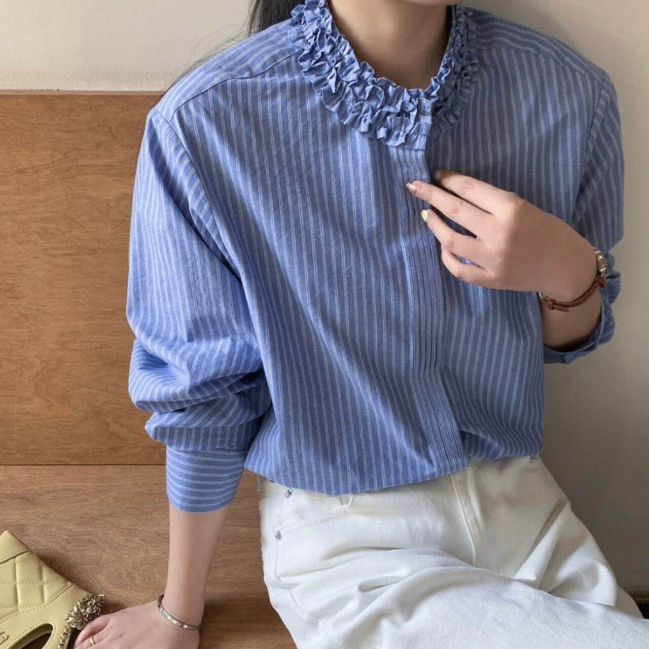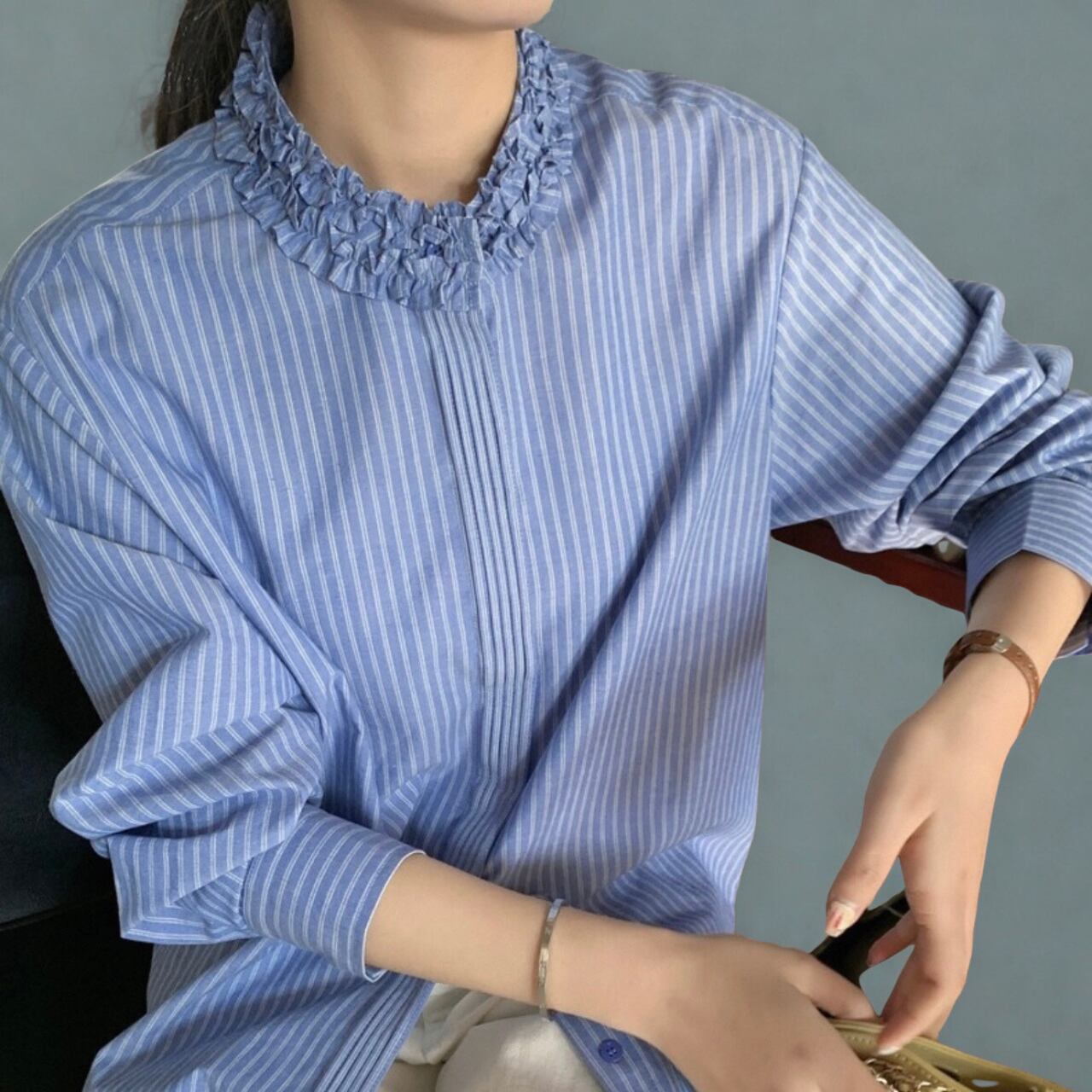 ストライプ柄が爽やかな印象を与える長袖シャツ。首元のフリルが、シンプルなデザインの中にさりげない遊び心をプラス。
