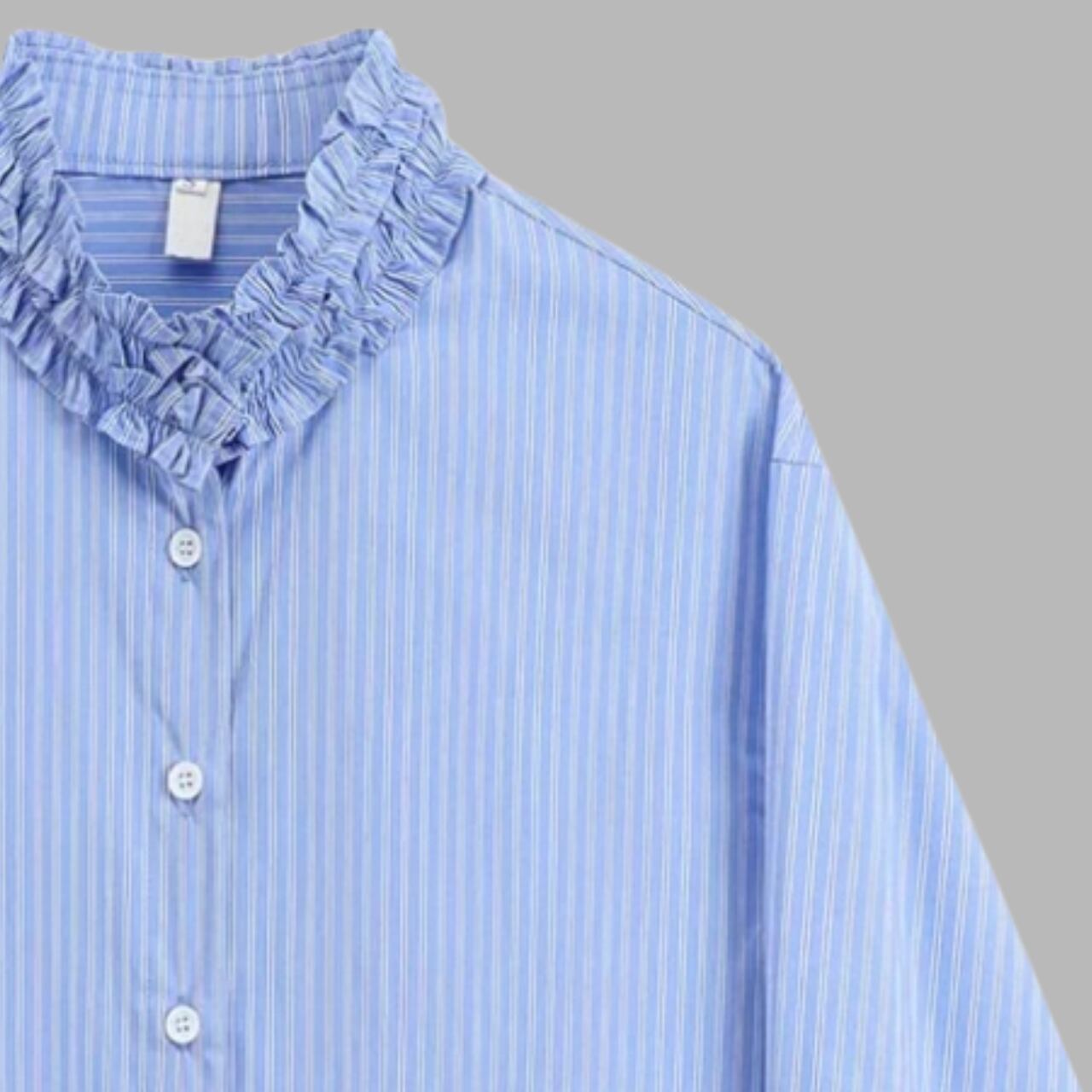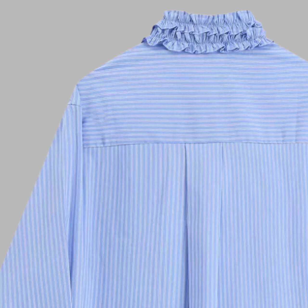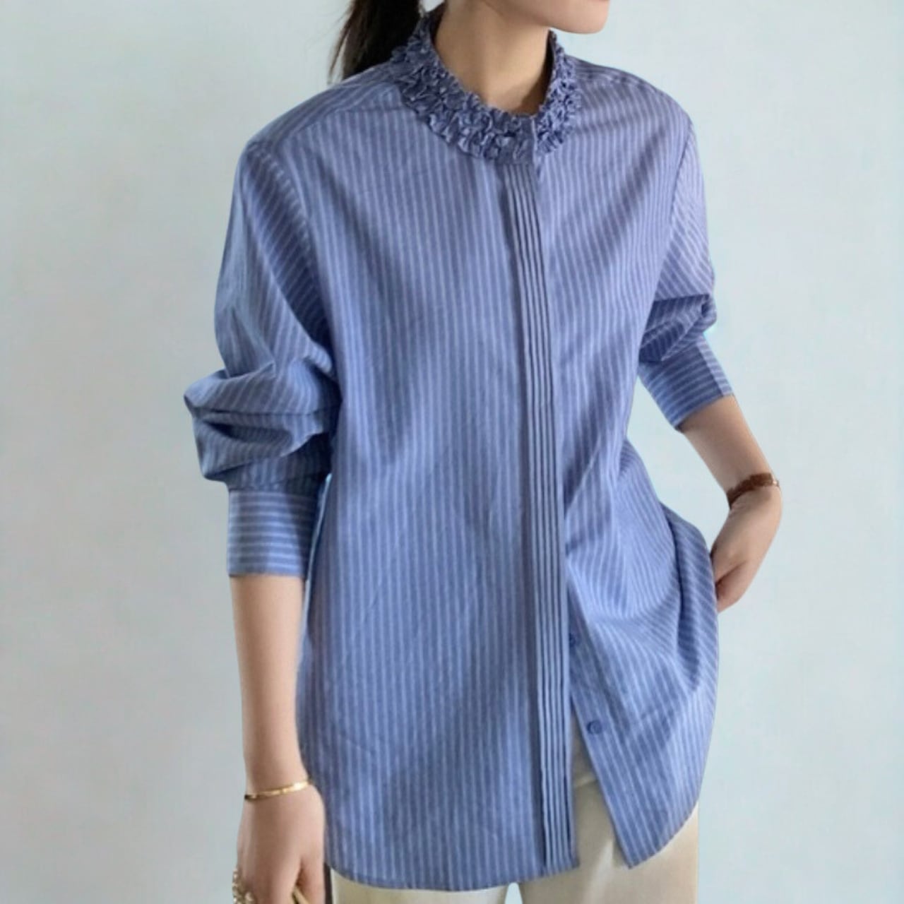 ストライプ柄が爽やかな印象を与える長袖シャツ。首元のフリルが、シンプルなデザインの中にさりげない遊び心をプラス。