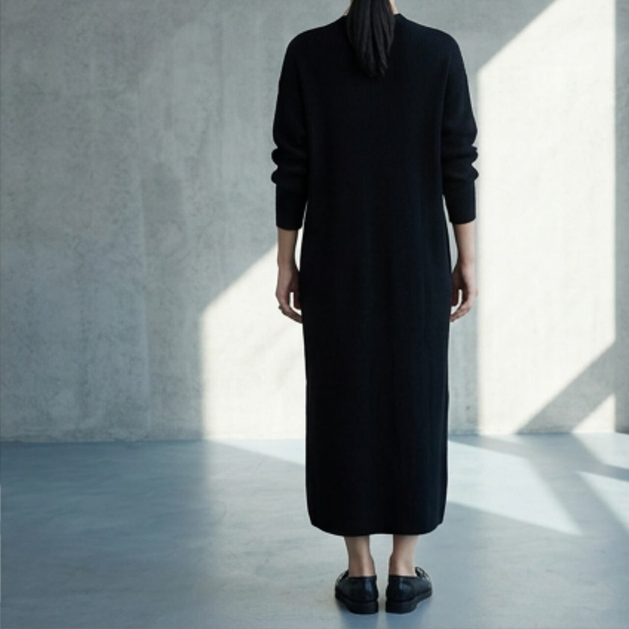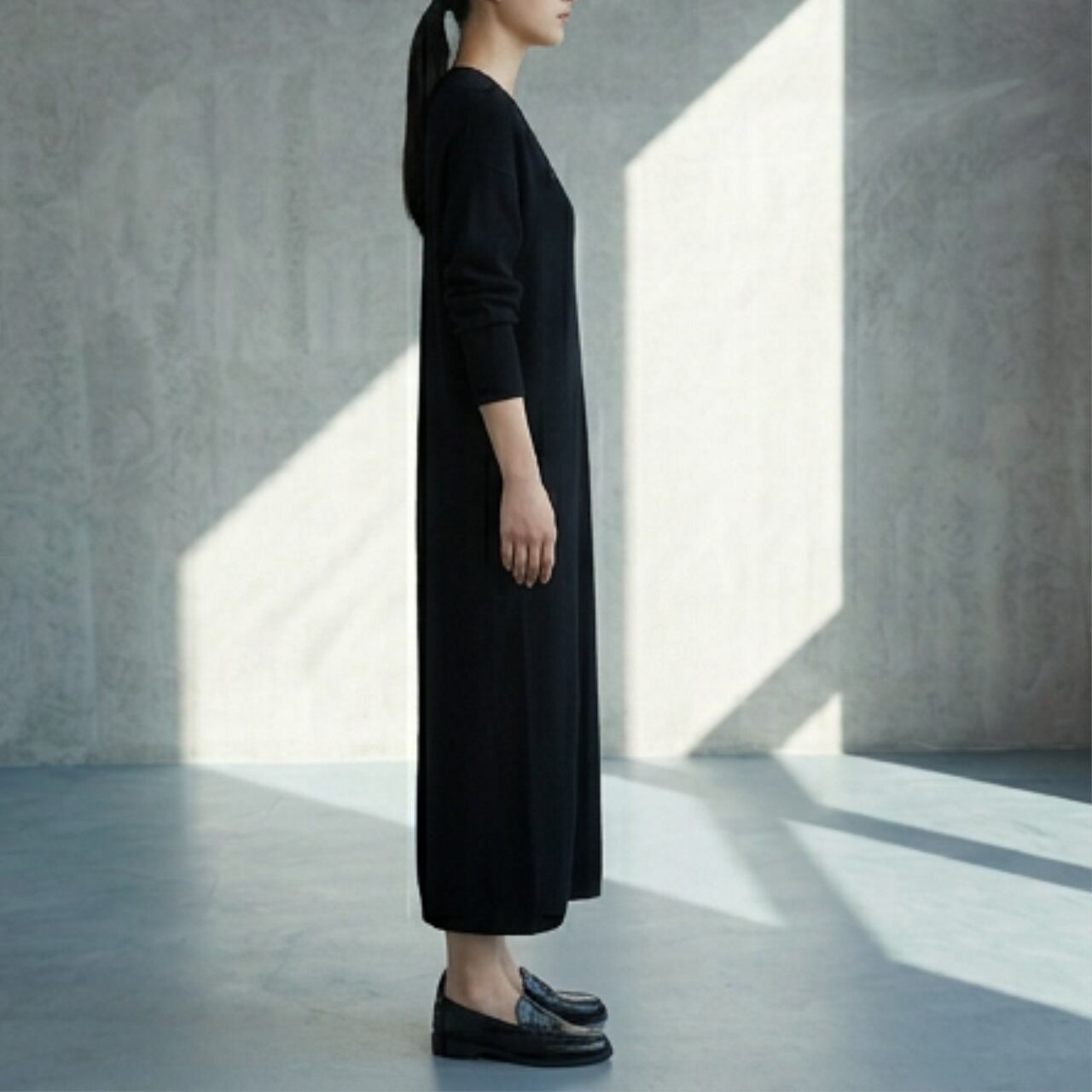 すっきりとしたVネックラインが特徴のマキシ丈ワンピース。シンプルながらも洗練されたデザインで、大人の女性らしい雰囲気を演出します。