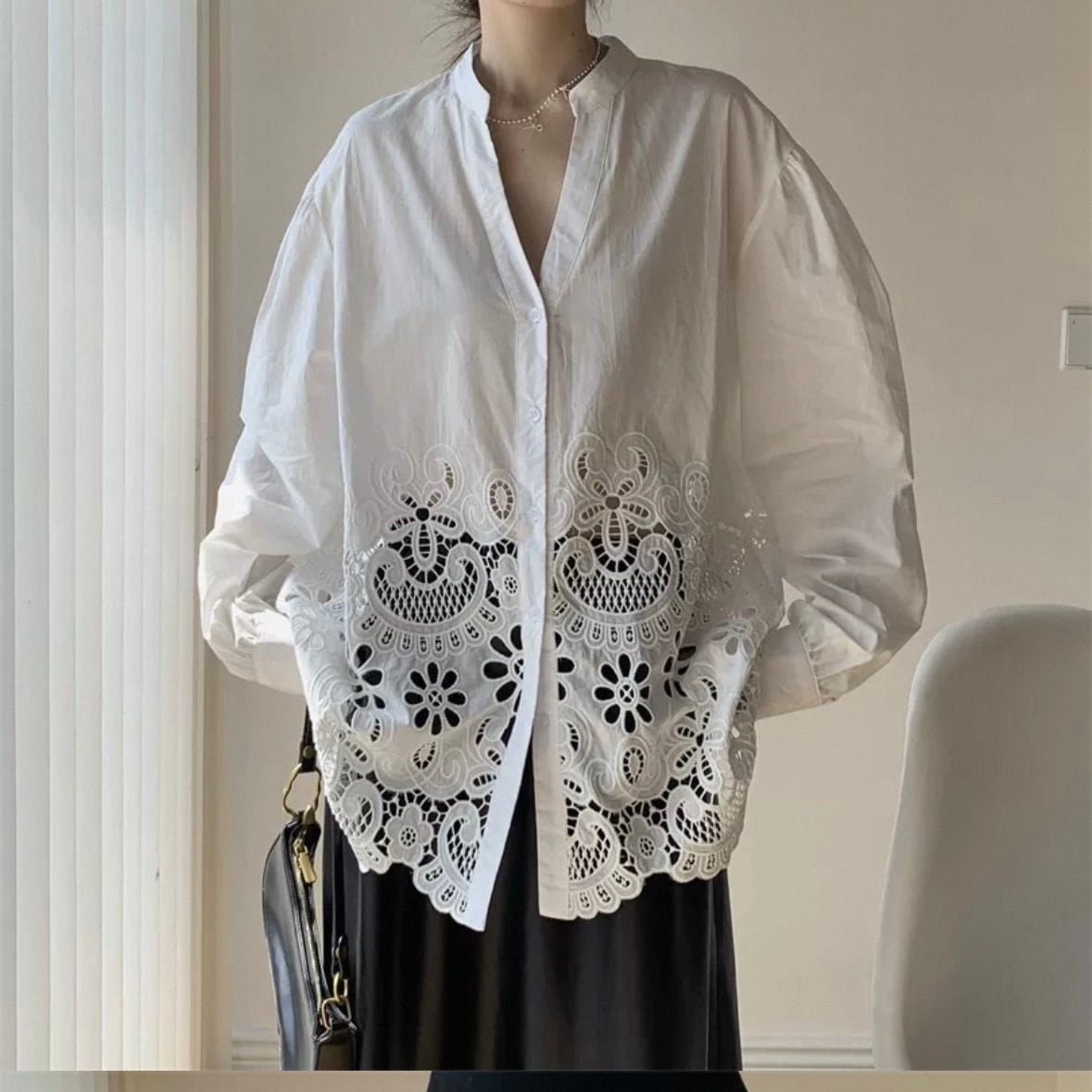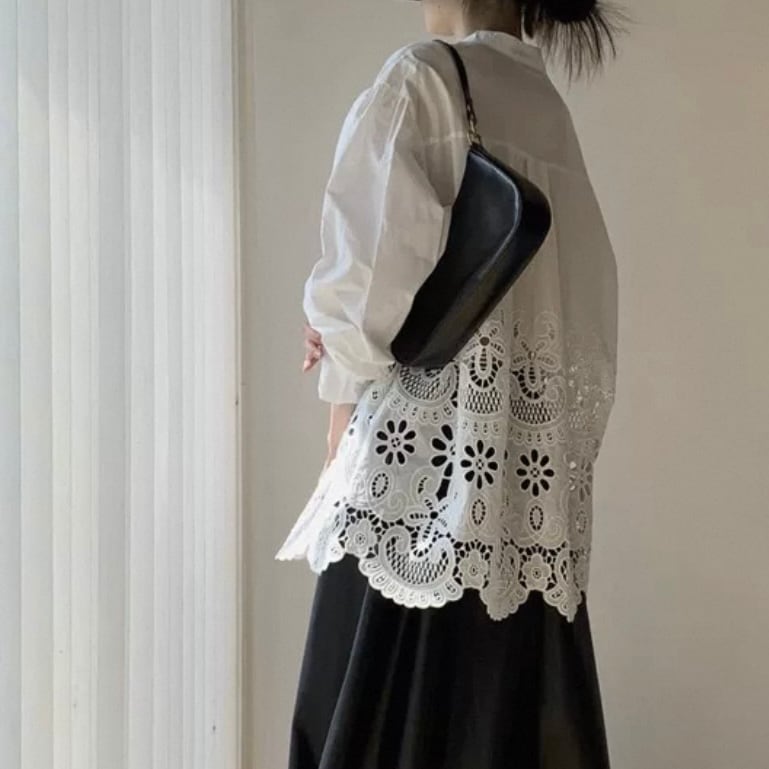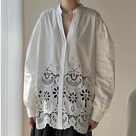 カットワークデザインが目を引く長袖シャツ。長めの丈なので、気になる体型もカバーしつつ、様々なボトムスとのコーディネートを楽しめます。